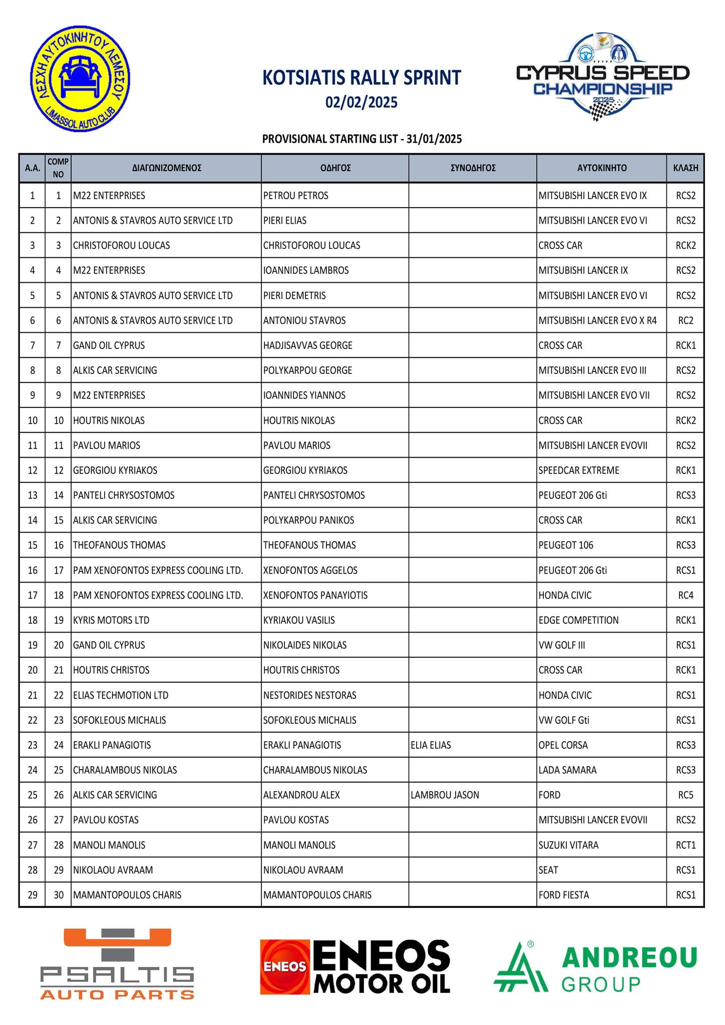 Το Παγκύπριο Πρωτάθλημα Αγώνων Ταχύτητας της Κυπριακής Ομοσπονδίας Αυτοκινήτου κάνει την πρεμιέρα του για το 2025 με τον αγώνα Kotsiatis Rally Sprint, που θα διεξαχθεί στις 2 Φεβρουαρίου 2025 και ξεκινάει στις 10:00 το πρωί. Με βάση τη δημοσιευμένη προσωρινή λίστα συμμετοχών, το ενδιαφέρον είναι ιδιαίτερα υψηλό, καθώς 29 οδηγοί είναι έτοιμοι να διεκδικήσουν τη νίκη σε διαφορετικές κατηγορίες.
