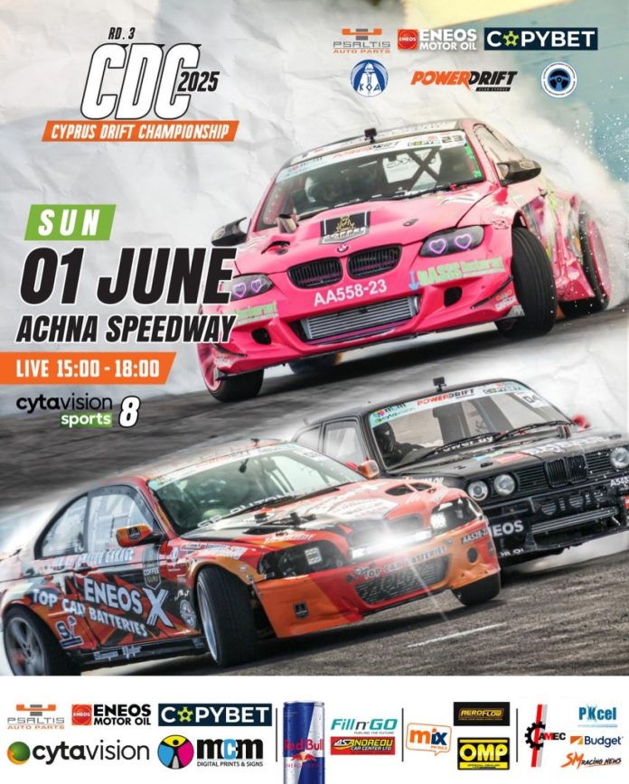Ο τρίτος γύρος του Παγκύπριου Πρωταθλήματος Πλαγιολίσθησης είναι προ των πυλών και υπόσχεται μοναδικές συγκινήσεις. Ο αγώνας θα διεξαχθεί την Κυριακή 1η Ιουνίου στην πίστα Achna Speedway, με τη διοργάνωση να ανήκει στο Power Drift Club.