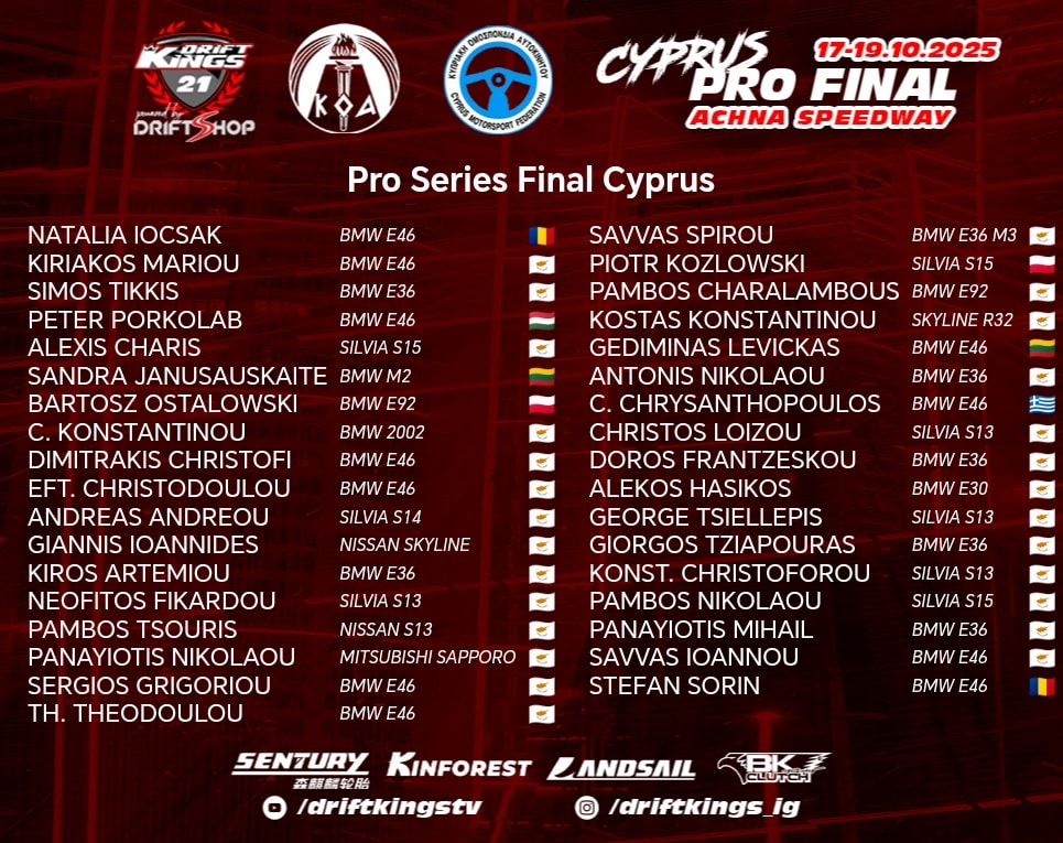 Το φινάλε της σεζόν του θεσμού Drift Kings Pro Final Cyprus 2025 αναμένεται να είναι εκρηκτικό και γεμάτο ένταση. Η πίστα Achna Speedway θα φιλοξενήσει στις 18 και 19 Οκτωβρίου τους κορυφαίους drifters της Ευρώπης σε έναν αγώνα που θα κρίνει τον τίτλο της χρονιάς, προσφέροντας στους θεατές καπνό, ταχύτητα και εντυπωσιακές μονομαχίες.