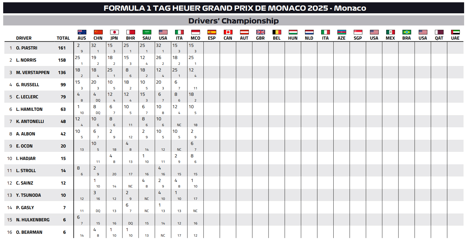 Η τελική κατάταξη του 8ου Grand Prix στο Μονακό έχει ως εξής: